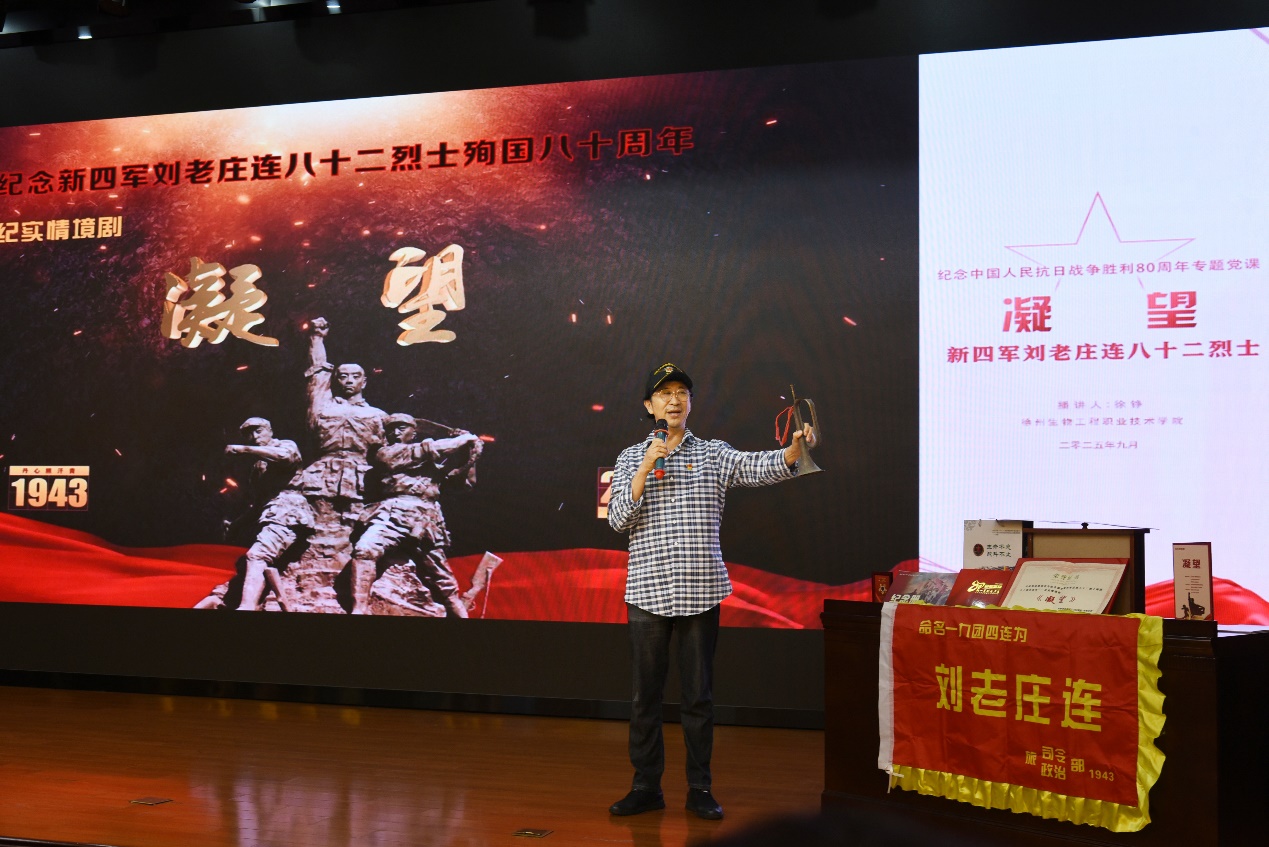 徐铮教授带来了以新四军刘老庄连八十二烈士为原型的大型纪实情境剧《凝望》,他以播讲的形式,先是生动细致地介绍了这部剧的编创过程——从史料的挖掘与筛选,到如何用艺术来再现真实的历史,再到如何通过人物塑造传递红色精神,他将编创过程中的思考与感悟娓娓道来,希望大家可以了解这段史实,并思考自己可以为国家、为民族做些什么。随后给大家展示了抗日老战士在战斗中使用的军号、刘老庄连赠予的奖章和证书等相关实物。接着,大家一起认真观看了这部大型纪实情境剧,该剧采用纪实情境剧的形式编排,在充分挖掘史料的基础上,让“剧”中人穿越时空与“史”中人相见,通过对话与情景表演展现了发生在这块英雄土地上的军民故事、家国情怀,并以“家国情”“报国志”“殉国血”“强军梦”这四幕勾勒出刘老庄连的前世今生。八十二位勇士“生命不息、战斗不止”的大无畏精神,军民之间的鱼水情深,深深震撼了在场的每一位师生。